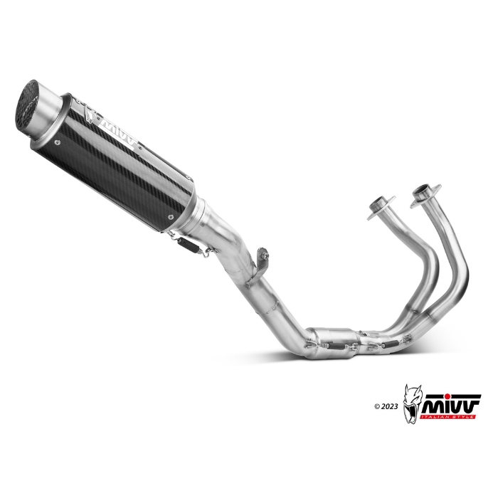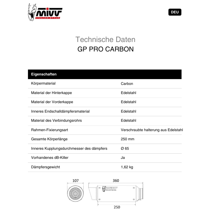 Das GP PRO zeigt eine TIG-halb handgefertigte Schweißung, ein Kompaktes und wesentliches Design und einen aggressiven Sound auf. Das von der Wettbewerbswelt inspirierte Ausgangsauspuffrohr ist mit einer abnehmbaren Schutzgitter ausgestattet, die den dB-killer verbirgt. Auf dem Endschalldämpfer erscheint das durch die Laser-Technologie hergestellte typische Mivv Logo.
